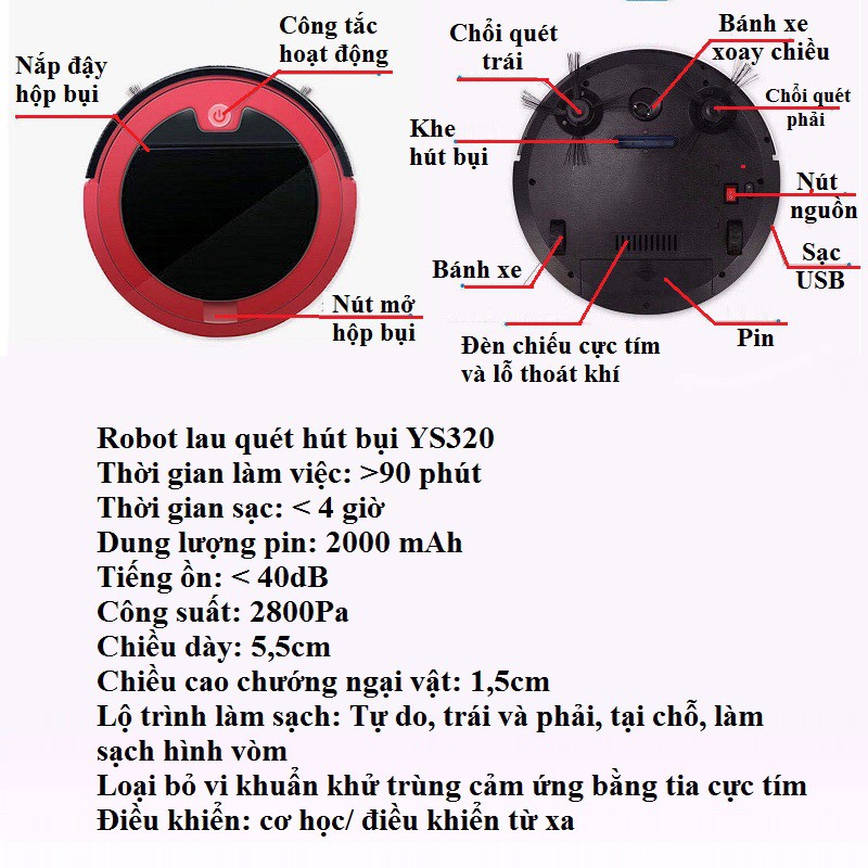 Robot YS320 lau quét hút bụi hiệu quả, điều khiển từ xa, khử trùng tia cực tímTên sản phẩm : Robot quét nhà hút bụi thông minh