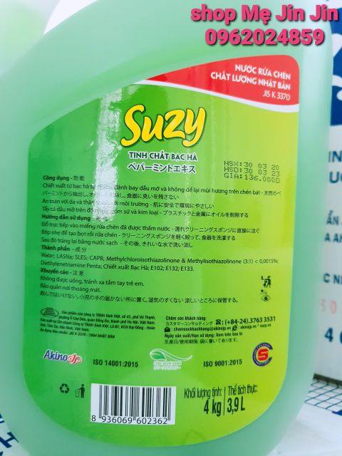 Nước rửa chén bát SUZY 4Kg -thành phần HỮU CƠ, chất lượng NHẬT BẢN