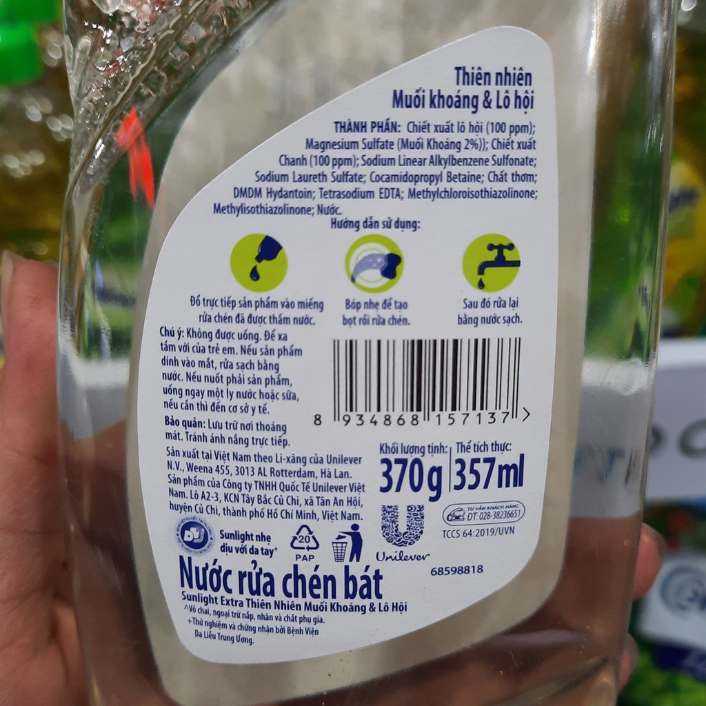 Nước rửa chén Sunlight Extra thiên nhiên muối khoáng và lô hội chai 370g- Nơi sản xuất: Việt Nam