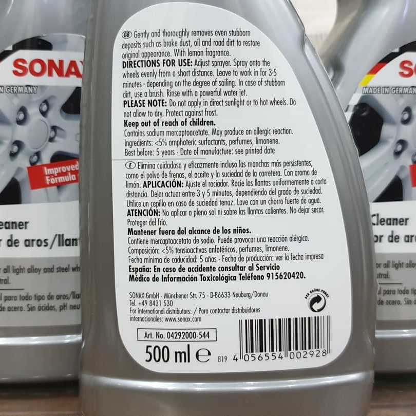Sonax Wheel Cleaner là dung dịch dạng chai xịt, giúp vệ sinh, làm sạch mâm xe (vành xe, la zăng) một cách đơn giản và hiệu quả. Sản phẩm thích hợp cho mọi loại mâm thép và mâm hợp kim, vòng thép má phanh đĩa.Việc làm sạch bụi bẩn,cặn dầu mỡ và mạt sắt trên bề mặt đĩa phanh cũng giúp loại bỏ tiếng kêu khó chịu của phanh đĩa.