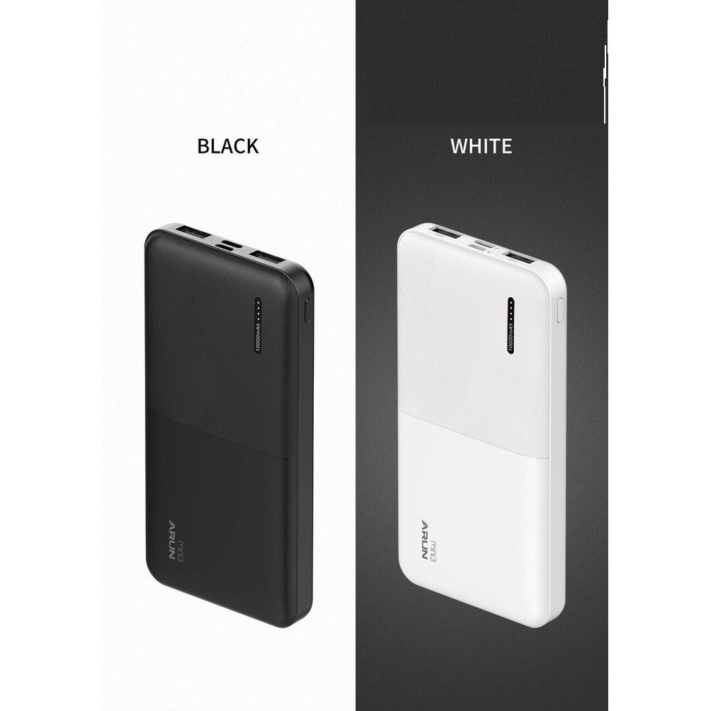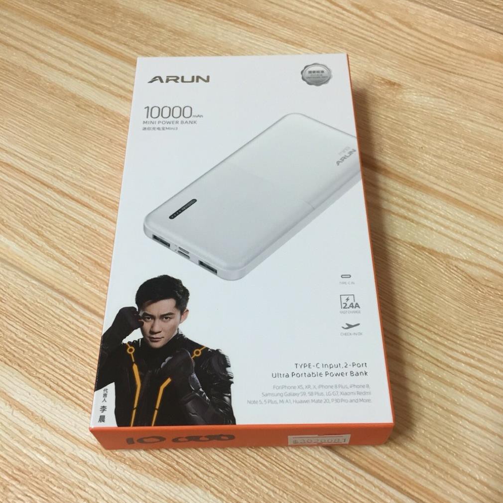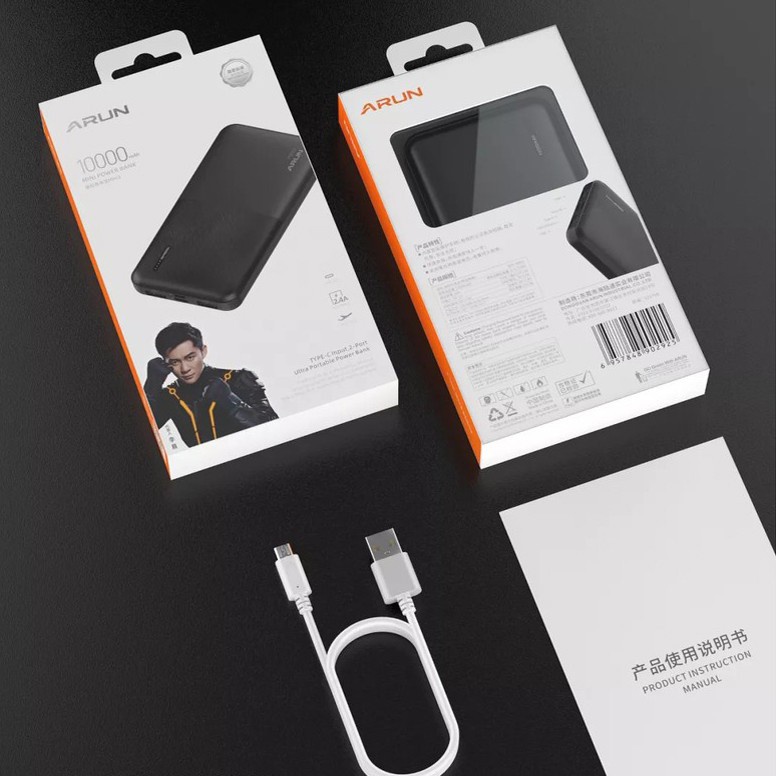 - Bộ sản phẩm gồm: 1 sạc dự phòng Arun 10.000 mAh + 1 cáp sạc USB Micro + 1 hộp đựng