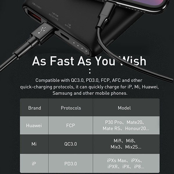 Pin dự phòng Baseus có thể nạp năng lượng cho tất cả các thiết bị smartphone có đầu vào DC 5V 9V 12V. Bạn sẽ không còn lo lắng về việc làm thế nào để nạp pin các thiết bị điện tử (điện thoại, máy ảnh, máy tính bảng, yendang0812…) khi đi du lịch, công tác hoặc mỗi khi mất điện nữa.