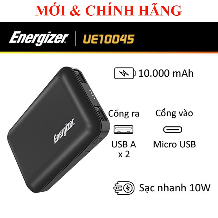 Điện Thoại & Phụ Kiện > Phụ kiện > Sạc dự phòng & Pin > Sạc dự phòng || Sạc dự phòng Energizer 10000mAh UE10045 - 2 cổng output, nhỏ gọn tiện lợiCòn hàng