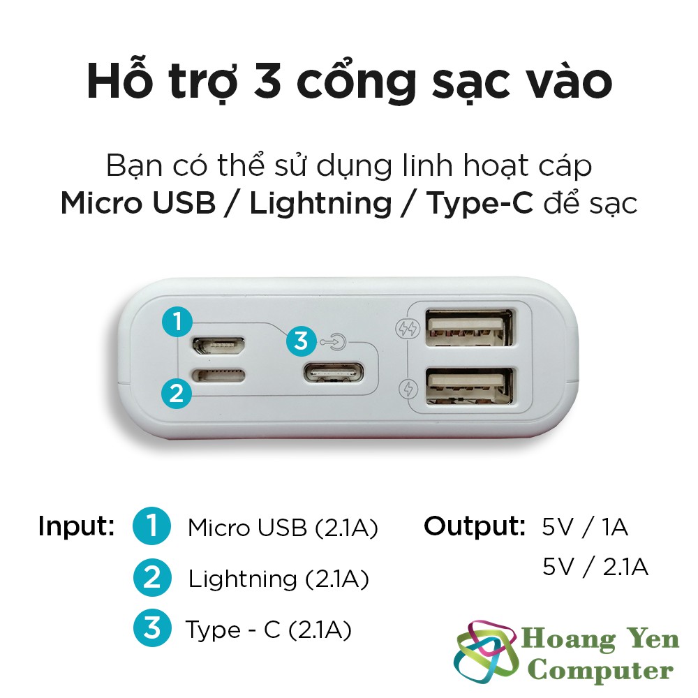 Với ưu điểm 3 cổng sạc vào Lightning , Micro Usb, Type C mang lại sự tiện lợi hơn bao giờ hết. Bạn có thẻ dùng bất kì cáp sạc nào trong 3 cổng trên để sạc cho pin. Chính vì vậy pin sẽ không đi kèm theo cáp sạc để giảm giá thành bán ra cho khách hàng