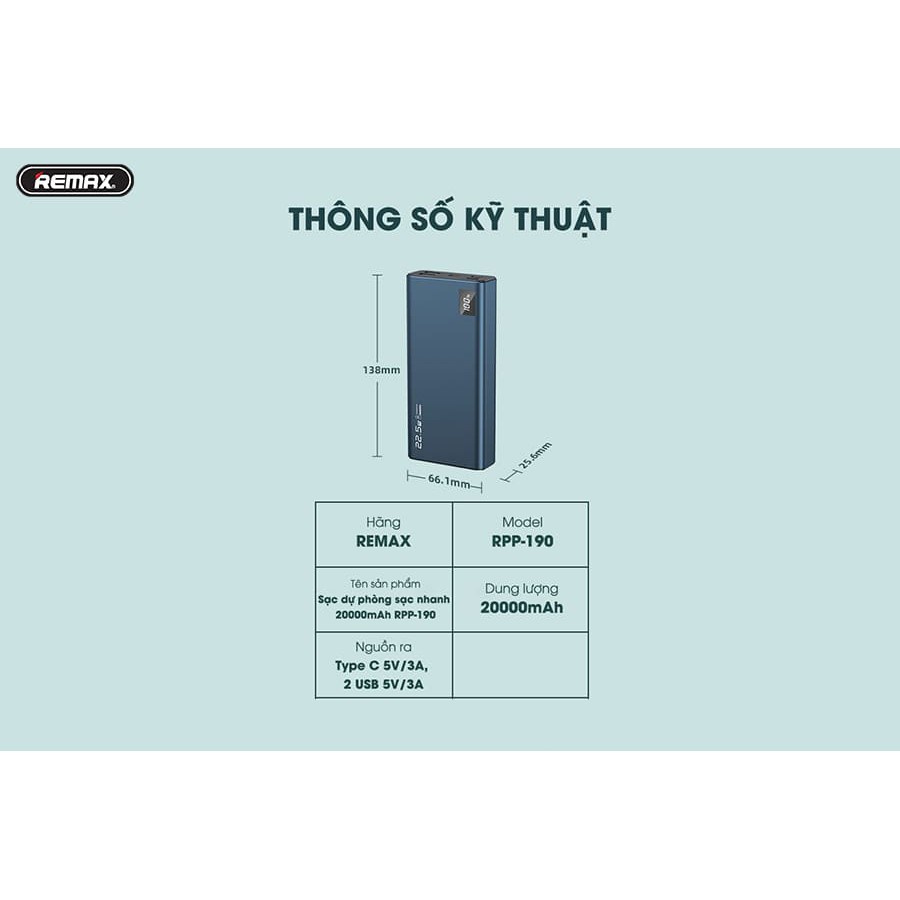 THÔNG SỐ KỸ THUẬT:Tên sản phẩm: Sạc dự phòng 20000mAh Remax RPP-190