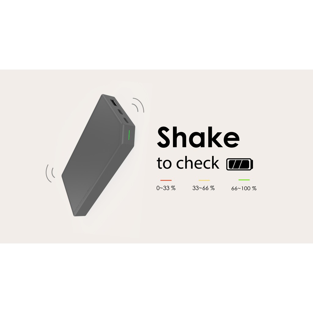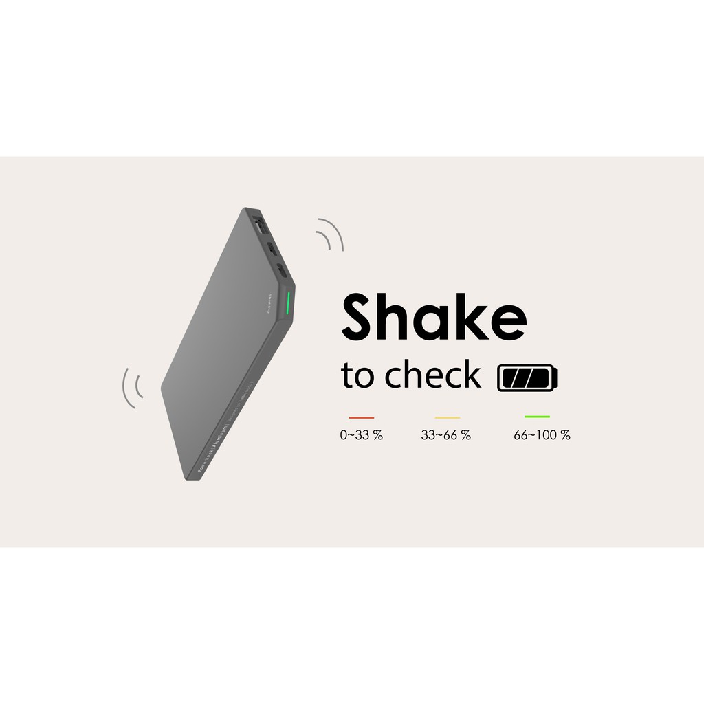 Điểm độc đáo của bộ sạc dự phòng Allocacoc PowerBank chính là không có bất kì một nút nhấn nào. Để có thể kiểm tra dung lượng pin còn lại, chỉ cần lắc nhẹ bộ sạc và nhìn vào tín hiệu đèn Led để biết được thông tin pin: màu đỏ (0-33%), màu vàng (34-66%), màu xanh (67-100%).