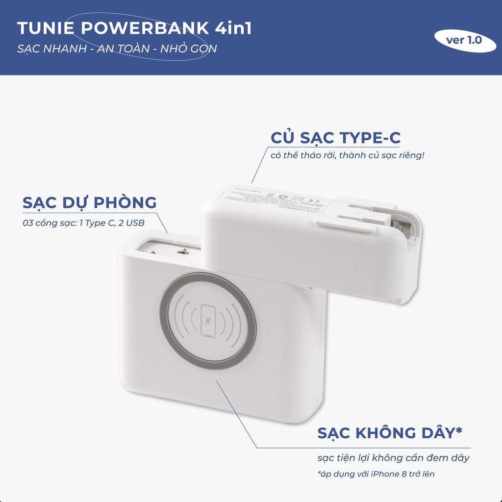 TUNIE POWERBANK 4in1 tự hào là dòng SẠC DỰ PHÒNG ưu việt nhất dành cho bạn, được đặc biệt tích hợp rất nhiều tiện ích cùng CÔNG NGHỆ SẠC NHANH an toàn và tối ưu nhất để sạc được tối đa 4 thiết bị cùng lúc chỉ trong cùng một thiết bị sạc!ƯU ĐIỂM NỔI BẬT: