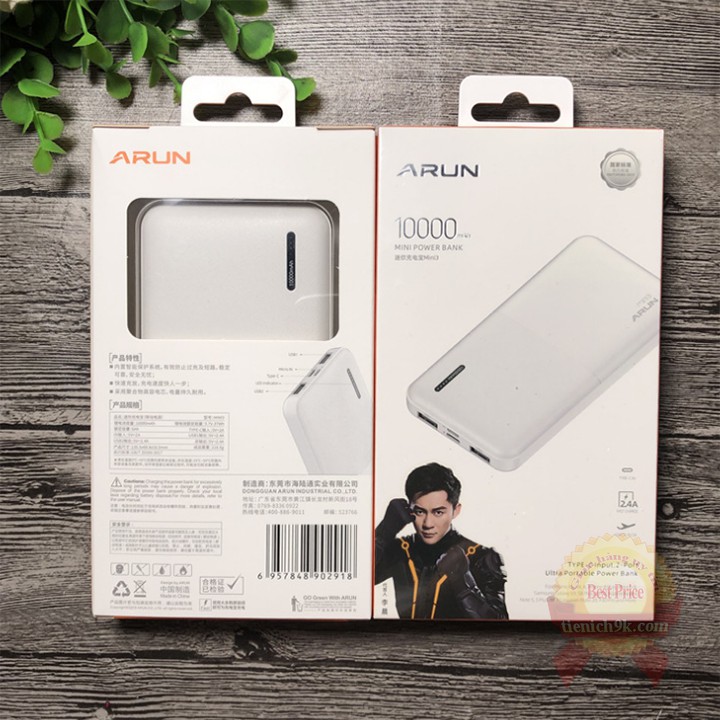 Sạc dự phòng Type_C 10000mah – Pin dự phòng Arun mini 3 siêu mỏng Type C Micro USB 2 cổng tiện lợi