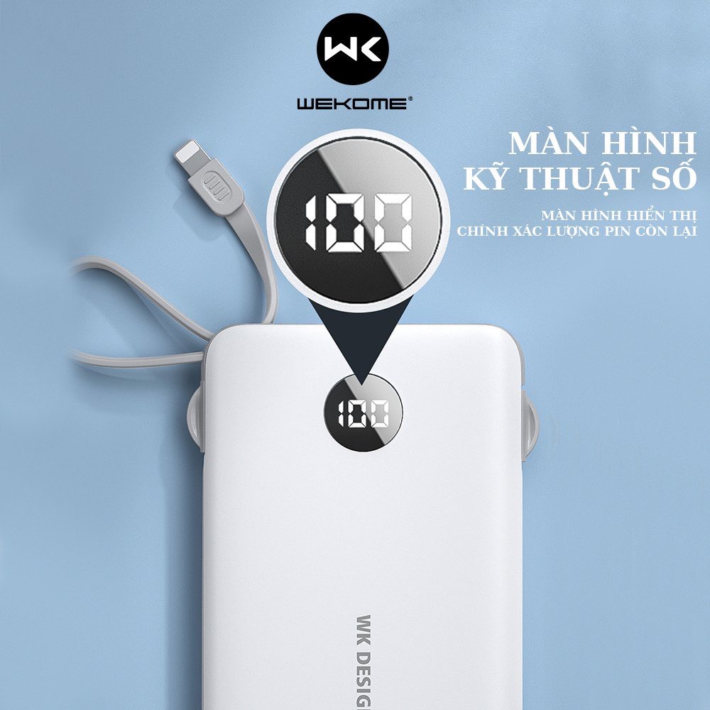 - Sở hữu thiết kế đơn giản cùng dung lượng 10000mAh, Sạc dự phòng Wekome WP-153 là một gợi ý thích hợp về giải pháp cung cấp năng lượng cho thiết bị trên mọi hành trình của bạn.