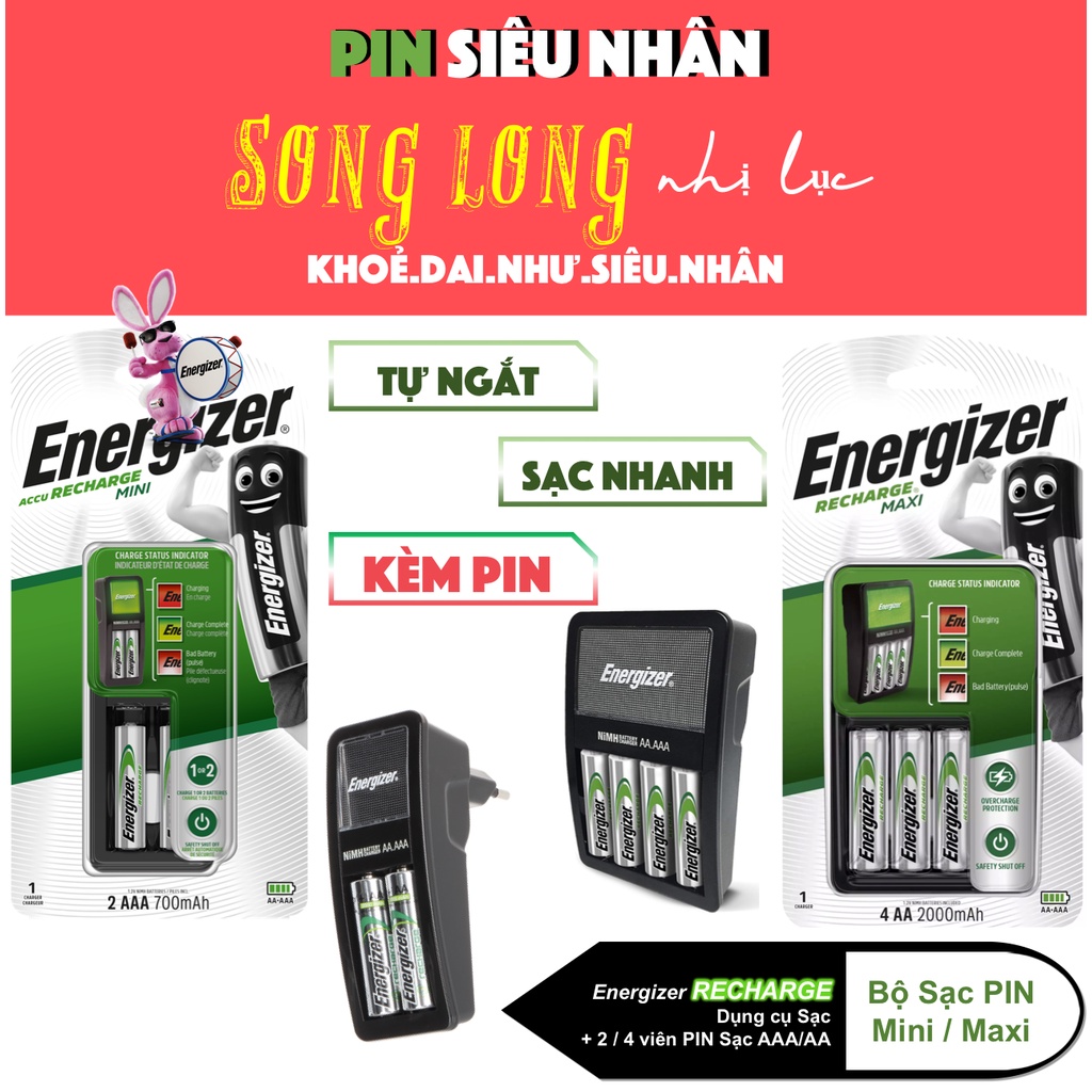 - Bộ sạc pin Energizer Recharge MAXI & MINI được sản xuất trên dậy chuyền công nghệ hiện đại chất lượng cao, an toàn với người sử dụng. Giúp bạn sạc được những viên pin nhanh chóng hơn nhờ tình năng sạc 4 viên pin hoặc 2 viên cùng một lúc, kích thước nhỏ gọn và tiện lợi di chuyển, là người bạn đồng hành cùng bạn trên mọi nẻo đường!