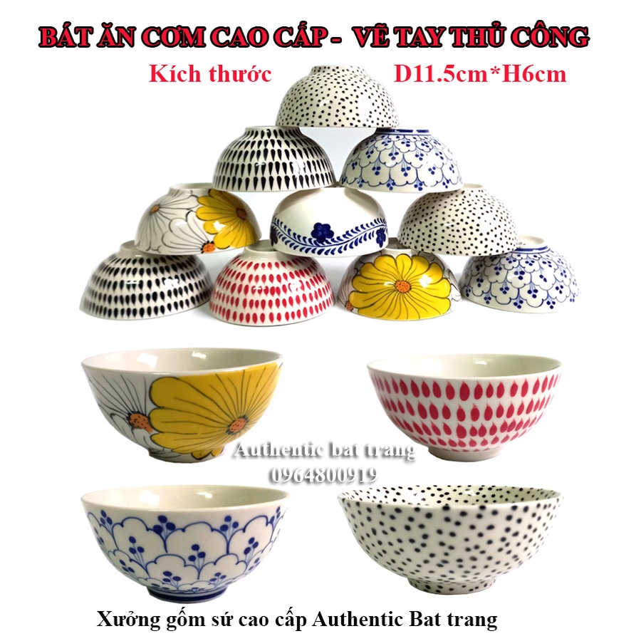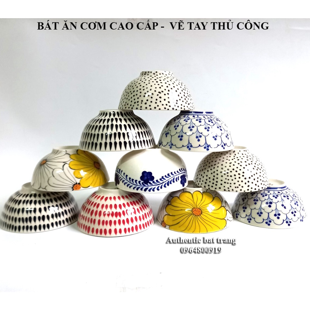 Mỗi bữa ăn gia đình hãy bạn mở nhà hàng cần các sản phẩm bát ăn cơm với họa tiết siêu đáng yêu, được các người thợ gốm nổi tiếng bát tràng. với nhiều họa tiết cho khách hàng lựa chọn như vẽ chấm bi, vẽ bèo, vẽ sen, vẽ chấm giọt mưa, vẽ hoa dây, vẽ hoa hướng dương.. Hãy đến ngay xưởng gốm sứ cao câp authentic bat trang để cùng thưởng thức.Sản phẩm bát ăn cơm vẽ tay thủ công được trau chuốt qua từng công đoạn tỉ mỉ và được nung qua 2 lần lửa và nhiệt độ nung chín 1300 độ C đảm bảo đẹp bền chắc an toàn trong lò vi sóng, máy rửa chén bát