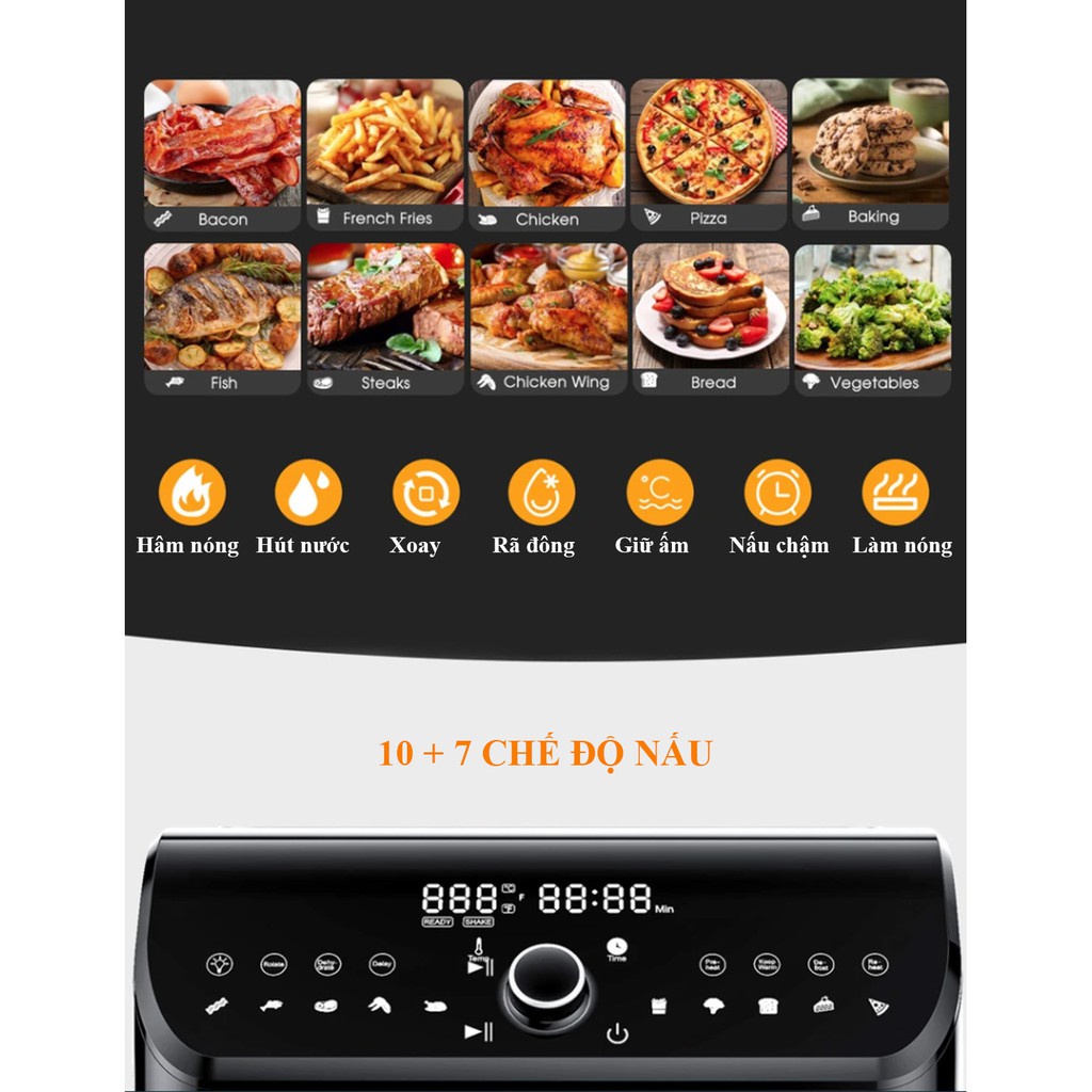 4️⃣ 10 chức năng chuyên sâu - nấu ăn chỉ với 1 nút chạm Nướng thịt, Khoai tây chiên, Gà quay, Pizza, Làm bánh, Nướng cá, Bít tết, Cánh gà nướng, Nướng bánh, Sấy rau củ quả