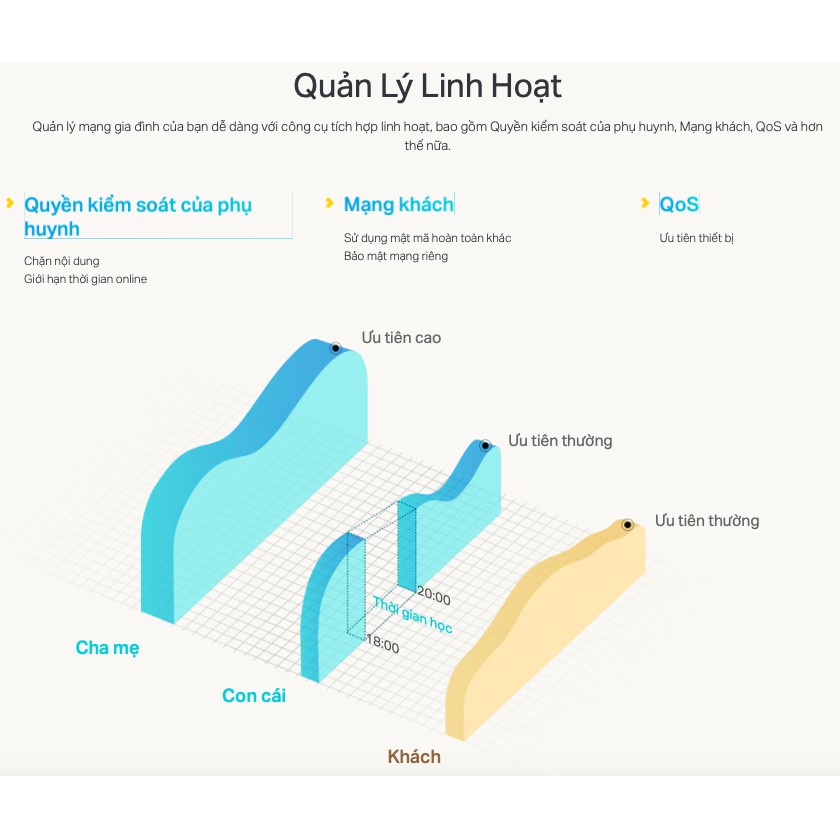 Quản lý mạng gia đình của bạn dễ dàng với công cụ tích hợp linh hoạt, bao gồm Quyền kiểm soát của phụ huynh, Mạng khách, QoS và hơn thế nữa.