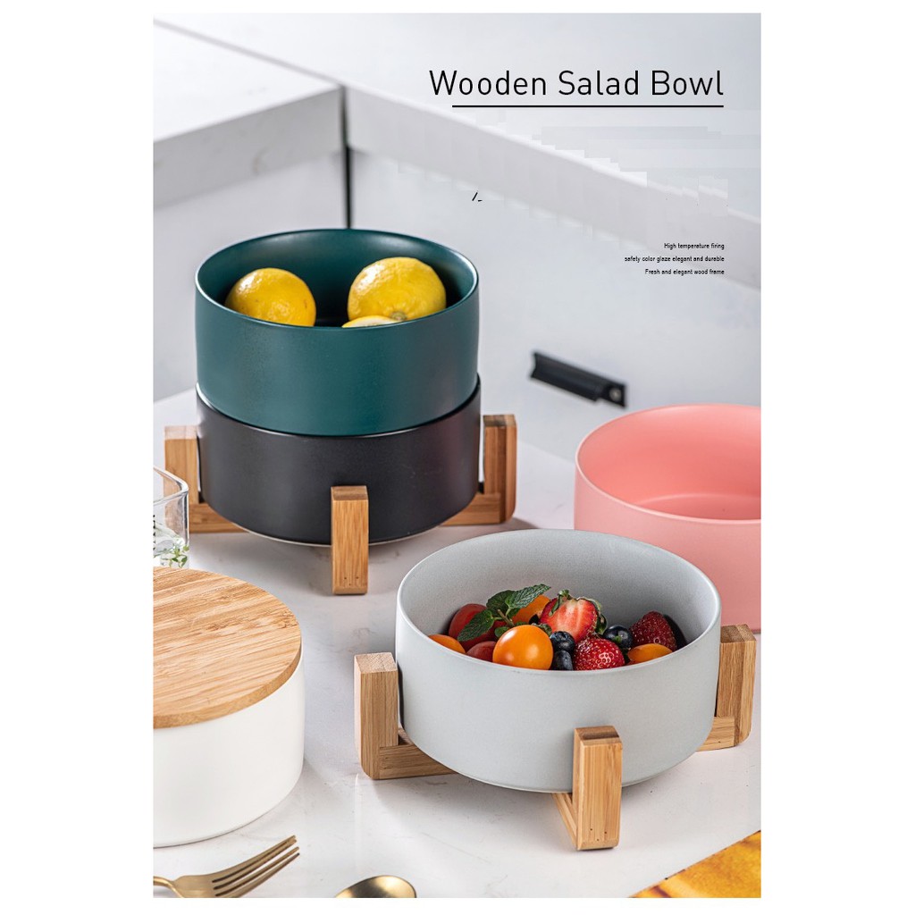 Giới thiệu (SẴN) Tô sứ kèm kệ gỗ chống nóng, tô salad sứ màu pastel phong cách Bắc Âu 16cm - Bát sứ cao cấp xuất khẩu