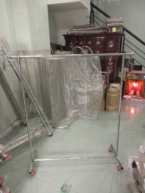 sào phơi đồ inox được làm từ 100% inox. loại chân vuông, có bánh xe loại tốt.sào cao 1,35m. dài 1,25m.