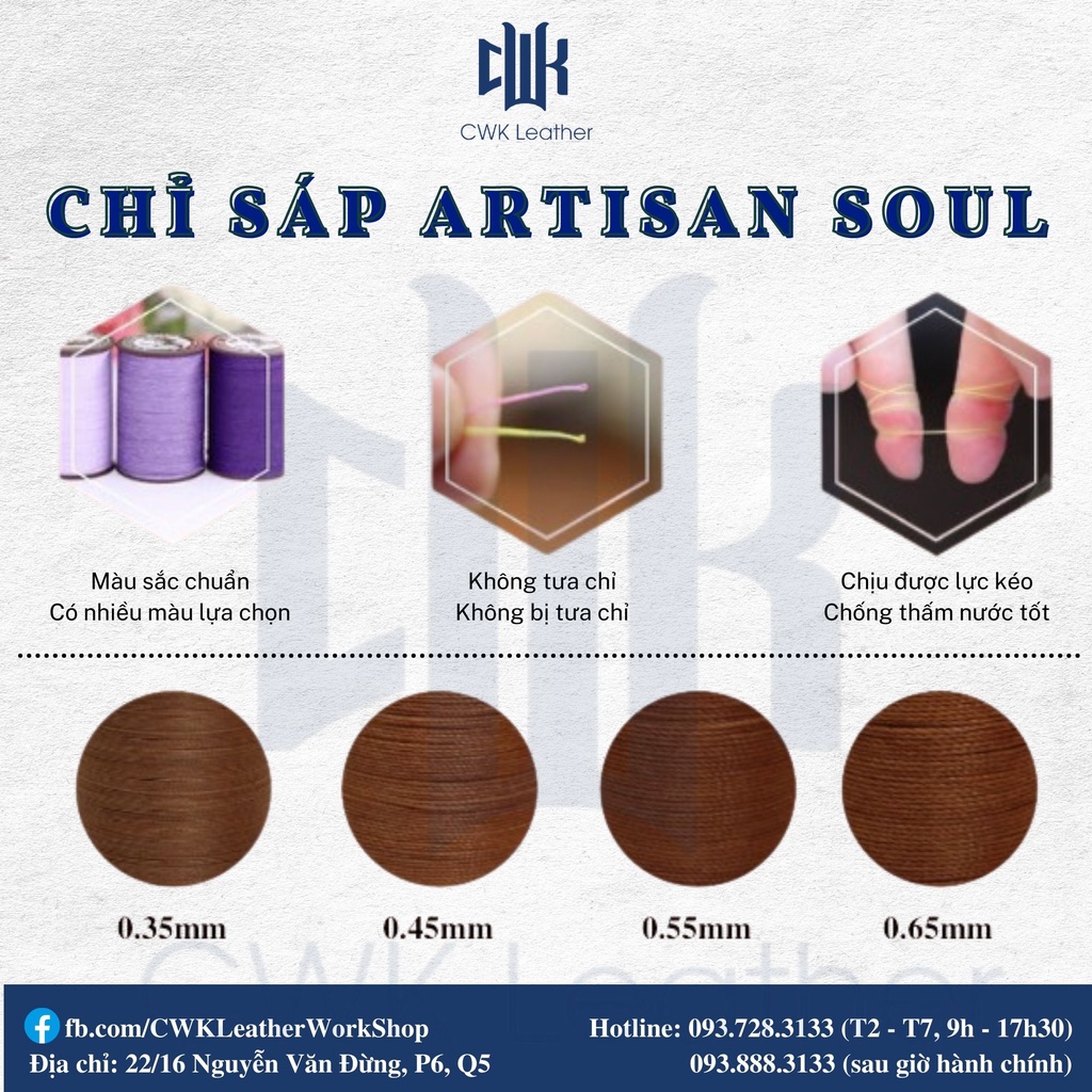 Chỉ Artisan Soul 3 lõi lượng sáp vừa đủ may tay và may máy đều được, chỉ có 45 màu và có 5 size chỉ, về hơn 1500 cuộn full size và full bảng màu.Loại chỉ này có giá tầm trung, dùng khá ổn, ưu điểm là có nhiều màu và sợi chỉ đanh, nếu may dây nịt chuốt nhẹ thêm tí sáp là được ạ, chỉ dòng này may đẹp nhất là size 0.35mm.