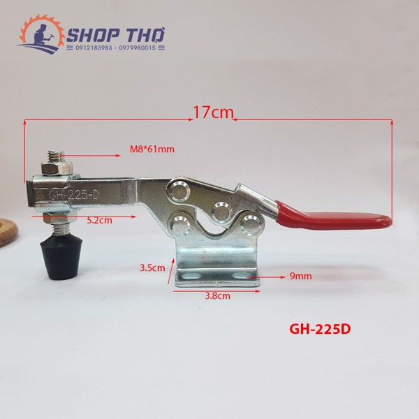 Sập vuông góc GH-225d (tổng dài 17cm)* Sập vuông góc GH-225D Tác dụng để giữ, kẹp phôi (gỗ) chắc chắn, thuận tiện cho công việc.