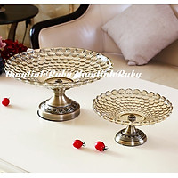 Đĩa thủy tinh trái cây nhũ vàng chân mạ đồng cao cấp, Dĩa khay thủy tinh đựng hoa quả bàn tiệc
