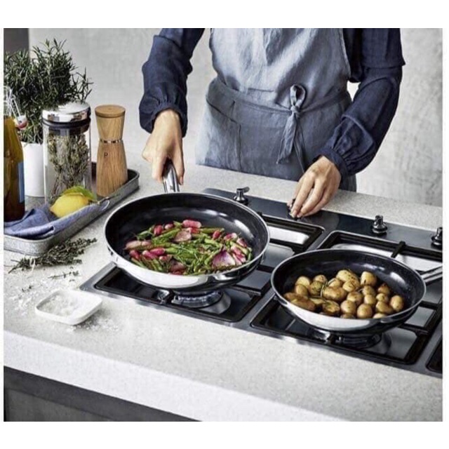 Chảo làm bằng thép không gỉ Cromagan (loại thép Châu Âu đăng ký bảo hộ độc quyền của WMF). Chảo đúc nguyên khuôn tiêu chuẩn Châu Âu chống trầy xước, ăn mòn, dẫn nhiệt dẫn từ tuyệt đối. An toàn trong máy rửa chén.