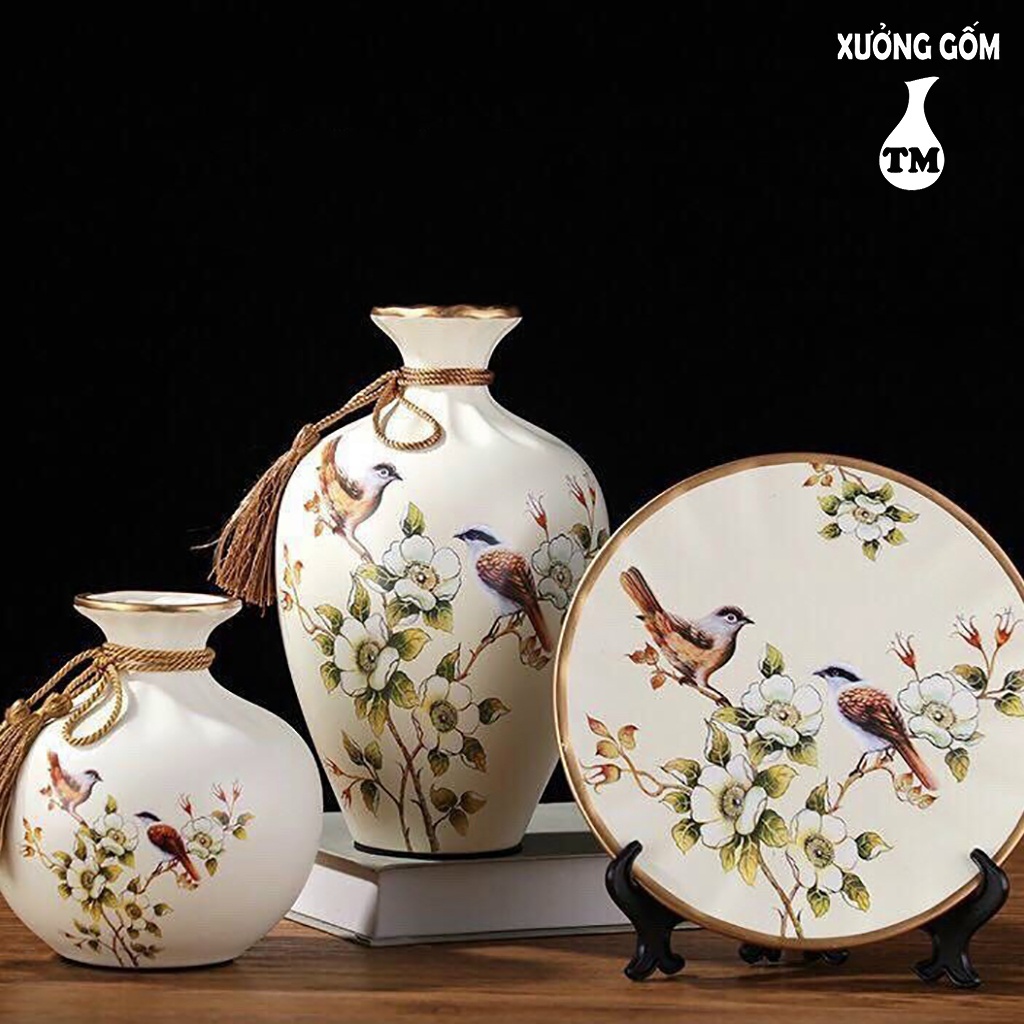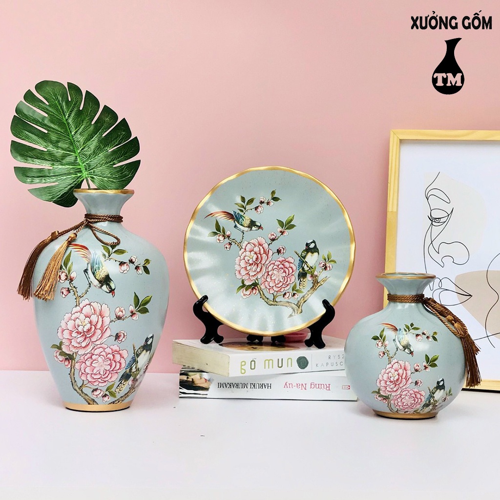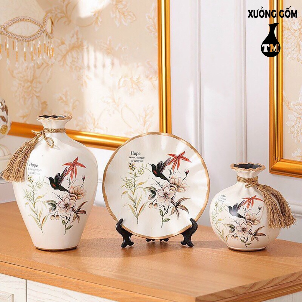 Set 3 Bình Hoa Xưởng Gốm TM Bát Tràng Họa Tiết Gốm Sứ Decor Cao Cấp (Giao mẫu ngẫu nhiên)