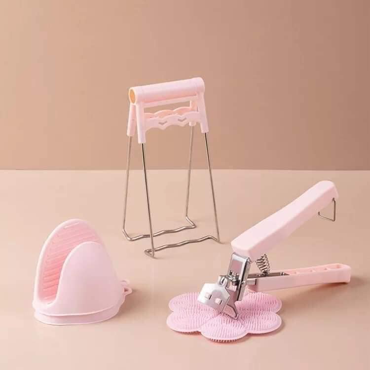 Sét 4 gồm: Gắp nóng, kẹp bát đĩa inox, bắc nồi silicon, lót nồi silicon