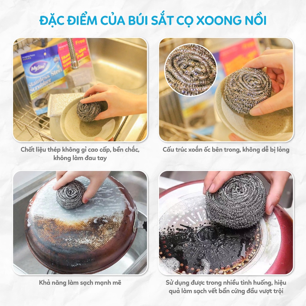 Giới thiệu SET 4 Miếng Búi Sắt Cọ Xoong Nồi KÈM Miếng Chà Nồi Đa Năng MyJae