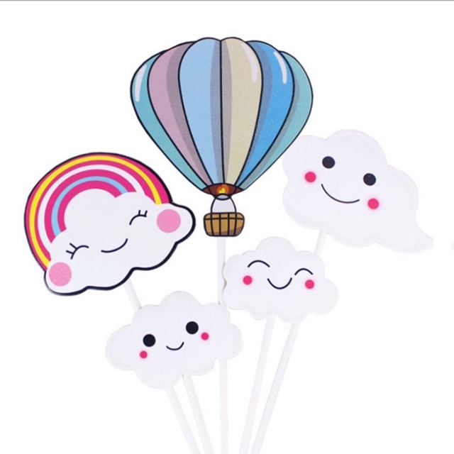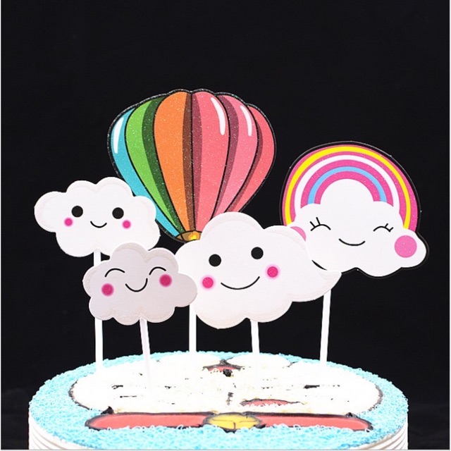 - Gồm 5 chi tiết : hình khinh khí cầu, hình cầu vồng và 3 hình mây dễ thương dùng để trang trí bánh kem, các loại bánh ngọt, cupcake,...