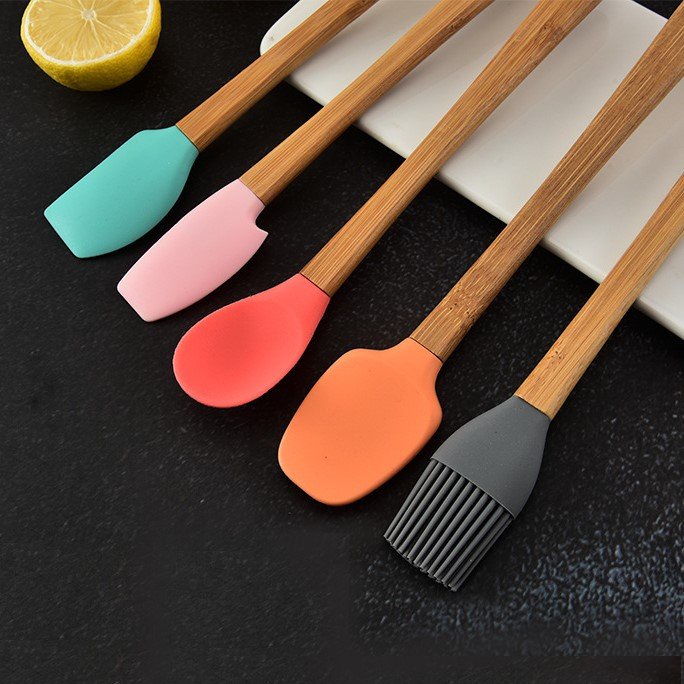 Set 5 món dụng cụ làm bếp - chất liệu silicon tay cầm gỗ tre dài 21cm