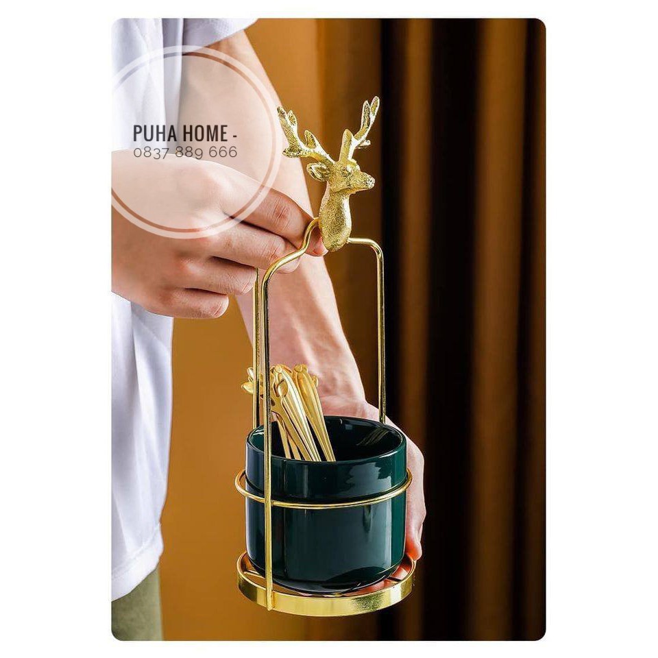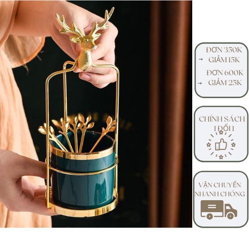 Nhà cửa & Đời sống > Dụng cụ nhà bếp > Dụng cụ pha trà, cà phê || SET 6 THÌA CÀ PHÊ, PHA TRÀ KÈM CỐC SỨ ĐỰNG THÌA VÀ LỒNG ĐẦU HƯƠU MẠ VÀNGCòn hàng