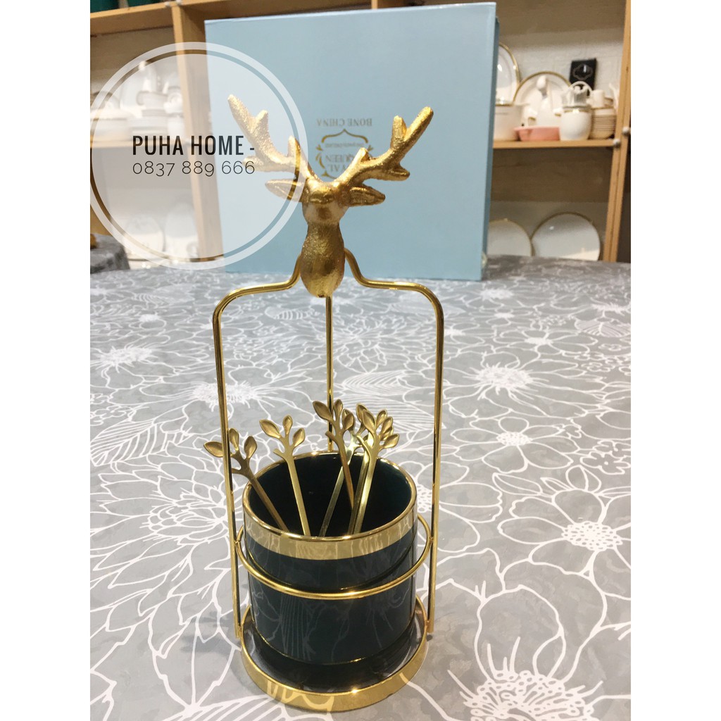 SET 6 THÌA CÀ PHÊ, PHA TRÀ KÈM CỐC SỨ ĐỰNG THÌA VÀ LỒNG ĐẦU HƯƠU MẠ VÀNG