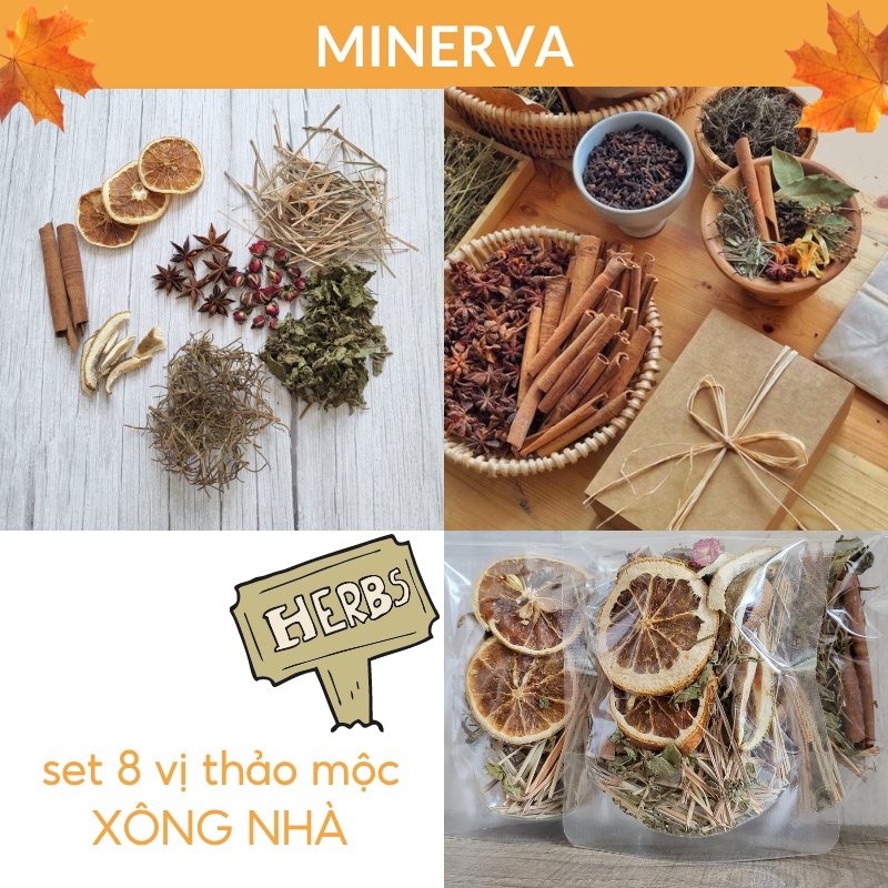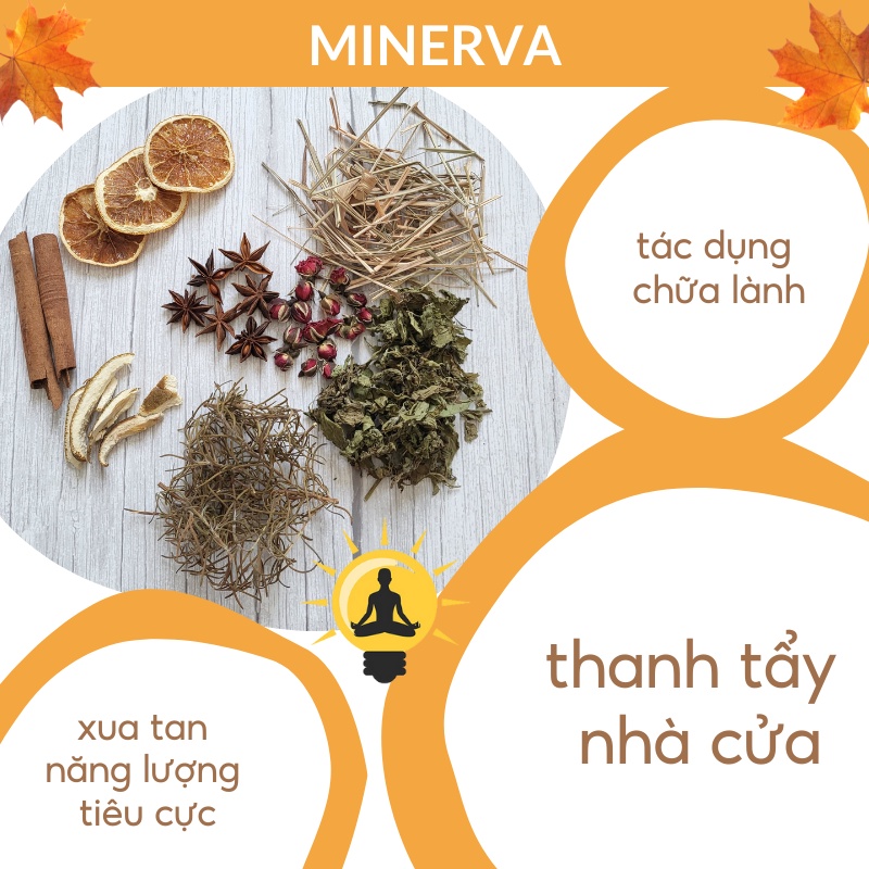 Set thảo mộc khô được #Minerva chọn lựa và trộn lẫn giữa 8 loại thảo mộc khác nhau, bao gồm cam khô, quế khô, vỏ bưởi, đại hồi, hương thảo, bạc hà, sả khô. Shop cho thêm một chút đầu hoa hồng tạo cảm giác thư giãn dễ chịu, chắc chắn sẽ mang đến một cảm giác thư thái thanh mát cho ngôi nhà của bạn