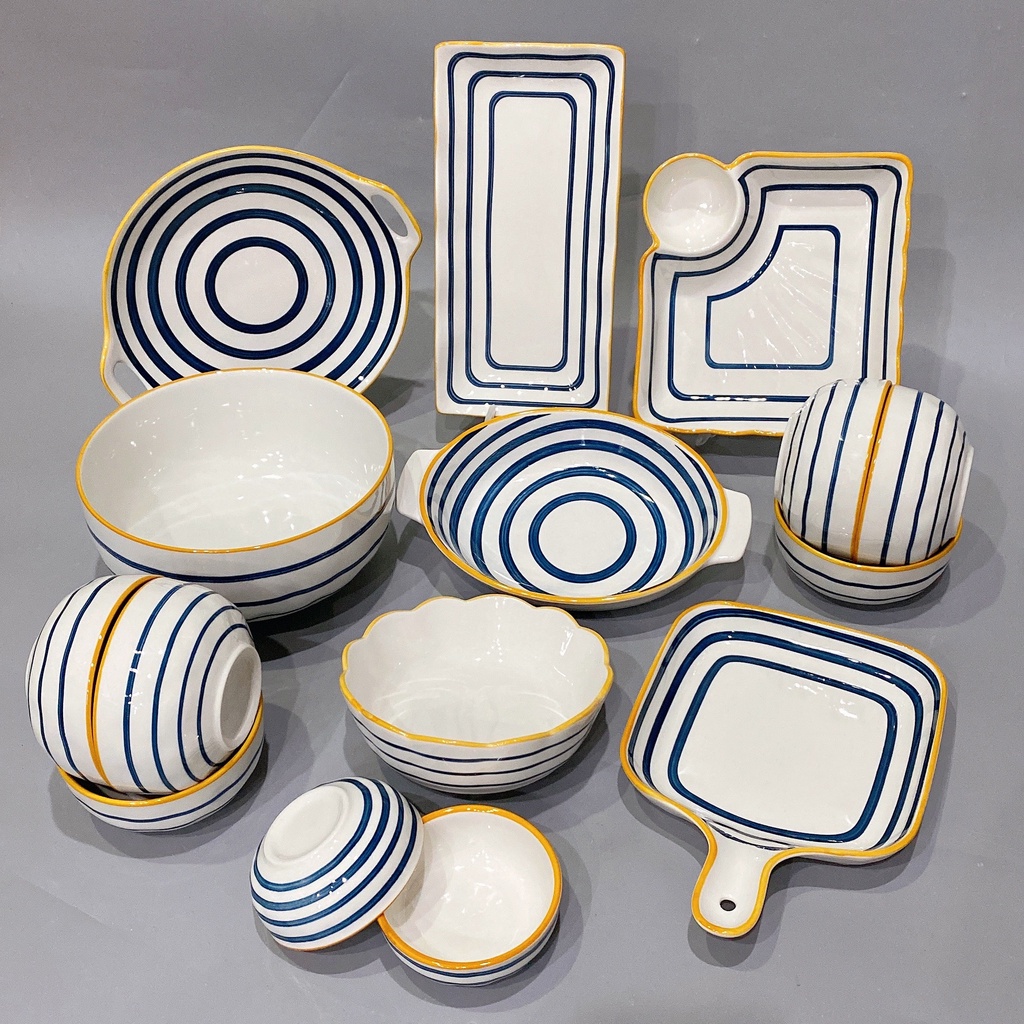 Set Bát Đĩa Chén Dĩa Sứ Viền Xanh Bát Ăn Cơm,ăn mì Tô Sứ Decor Dễ Thương