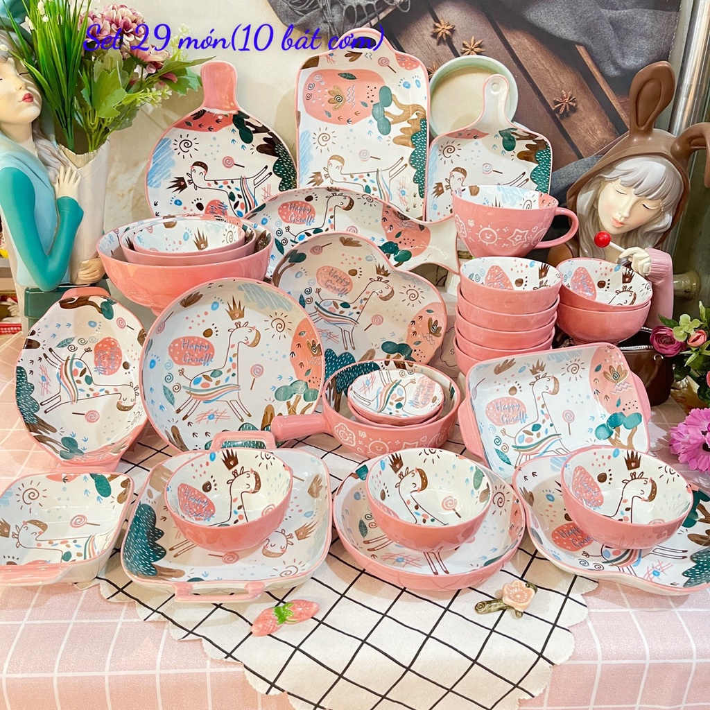 Set Bát Đĩa Decor Hươu Hồng Bát Ăn Cơm Chén Dĩa Dễ Thương Bát Ăn Dặm Cho Bé