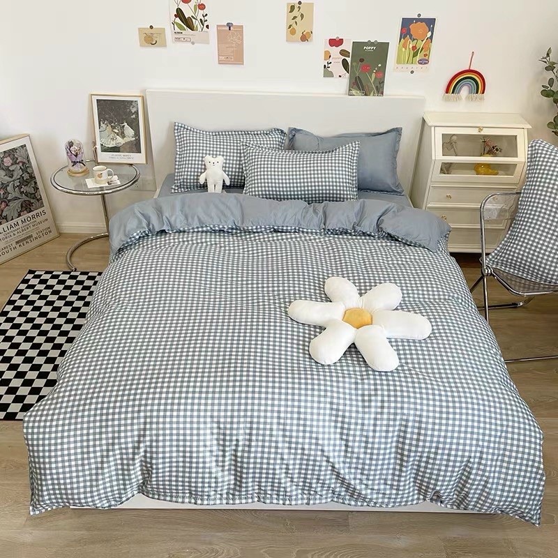 SET Chăn ga Cotton poly 4 Món kẻ caro xanh ga gối đệm cao cấp