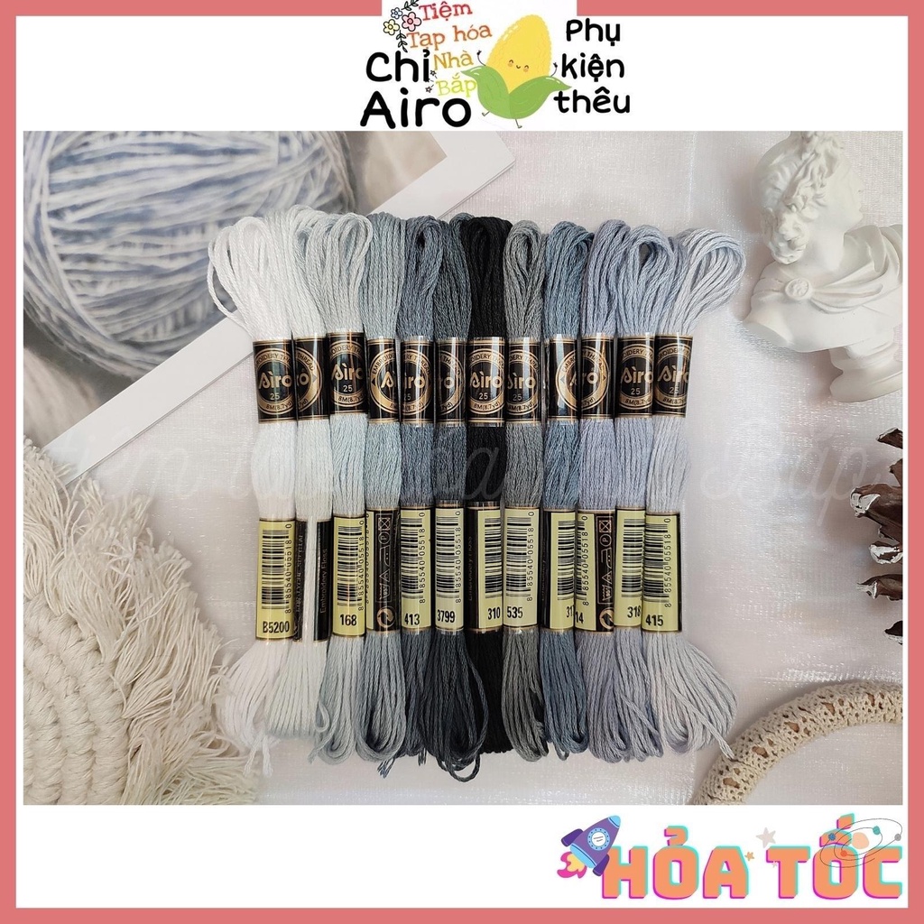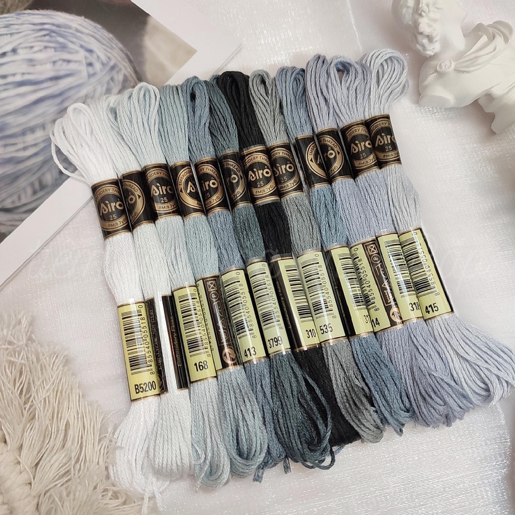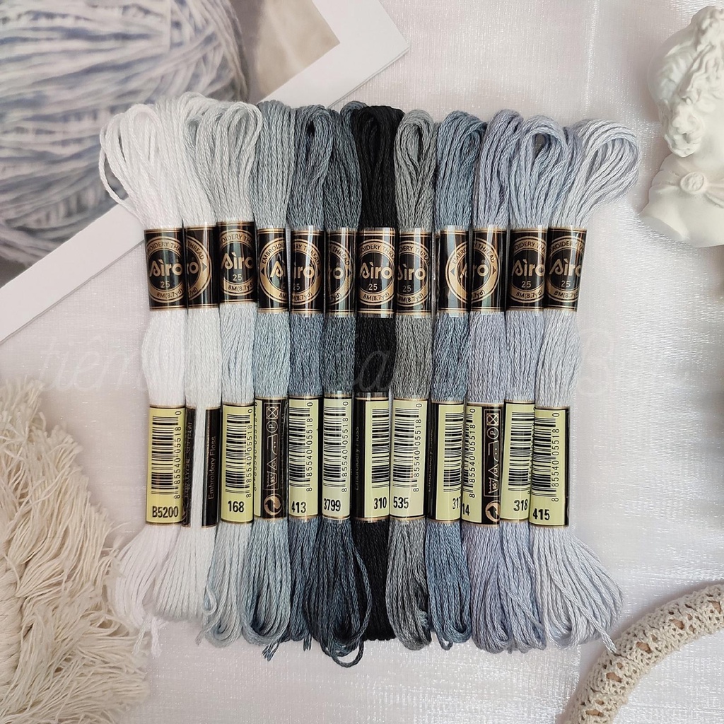 Set Chỉ Airo Tông Xám các con chỉ được tiệm nhà Bắp chọn và mix, xếp theo nhóm từng tông màu xanh thông dụng nhất.