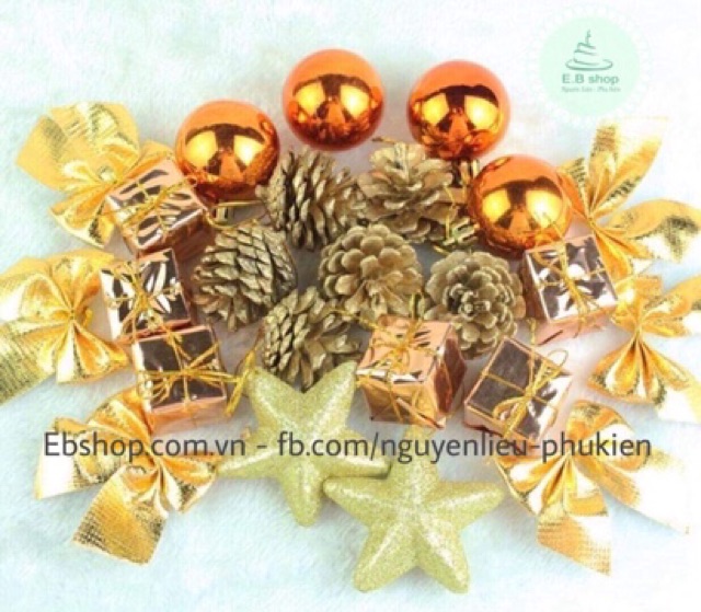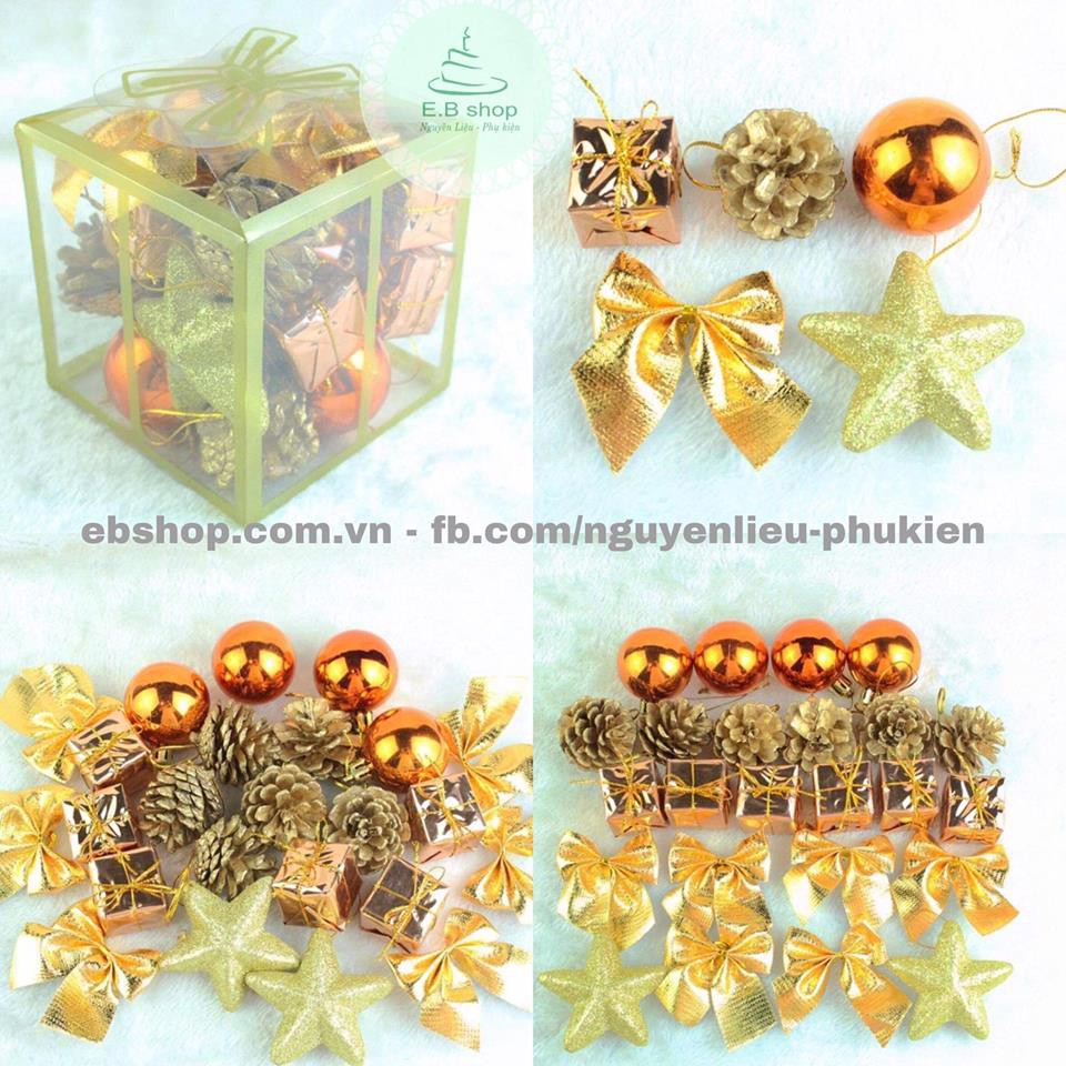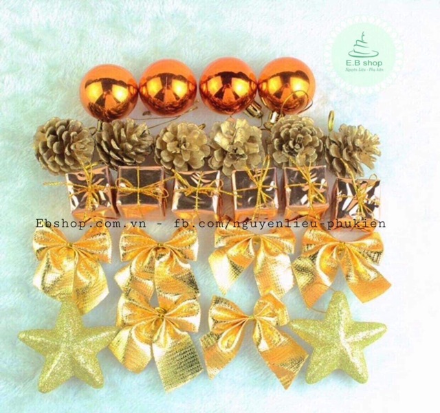 Gồm 2 lựa chon:1/ Set 24 đồ trang trí Noel màu vàng: gồm có quả châu, chuông, trống,chuông hoa, chữ Merry Christmas,.. theo một tone để bạn trang trí dịp giáng sinh thật lung linh