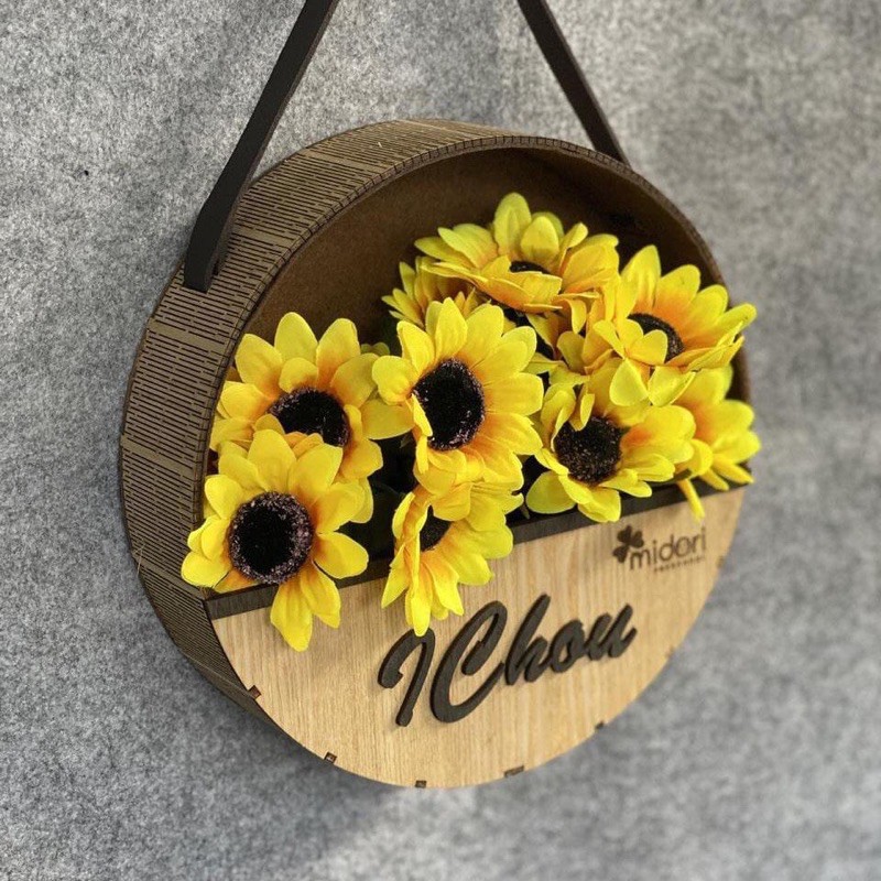 - Giỏ hoa treo tường chất liệu gỗ, đã được xử lý chống ẩm mốc, dây da, dán vải dạ và kết hợp dán chữ nổi 3D.