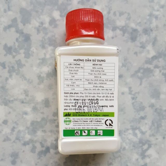 Vật tư nông nghiệp Thành Loan chuyên bán buôn bán lẻ tại Hà Nội vật tư, Công dụng: chuyên trị các loại bệnh hại cây trồng như thán thư, phấn trắng, héo cây con, đốm lá, sương mai, mốc sương, bệnh sẹo, giả sương mai, đạo ôn, khô vằn,.....Hướng dẫn sử dụng: hoà tan 10~15ml/10~12 lít nước phun cho cây vào sáng sớm hoặc chiều mát. - Lh mua hàng zalo 0963031830 để được nhận sản phẩm nhanh nhất.