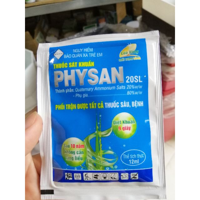 Công dụng: – Đặc trị: bệnh do vi khuẩn, bệnh lúa von trên lúa, bệnh xì mủ dưa hấu, bệnh loét, rêu hại cây có múi. – Hiệu quả ngay sau khi phun 10 phút nên tránh được rủi ro do trời mưa – Lưu ý: Thuốc mạnh nên phải pha đúng liều – Liều lượng 2cc/1lit nước Tính chất sản phẩm: – PHYSAN 20SL là thuốc sát khuẩn cực mạnh, có phổ tác dụng rất rộng, tiêu diệt hầu hết các mầm mống gây bệnh cho cây trồng như: Nấm, Vi khuẩn, Virus, Rong, Rêu, Tảo. – PHYSAN 20SL tiêu diệt được 2 loài vi khuẩn gam âm và vi khuẩn gam dương. – PHYSAN 20SL được cây trồng hấp thu rất nhanh nên không bị rửa trôi… - Lh mua hàng zalo 0963031830 để được nhận sản phẩm nhanh nhất.