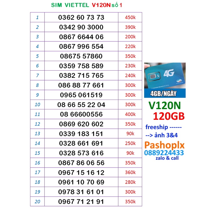 Giới thiệu Sim V120N 10 số đẹp viettel 4g số 1( 120gb 1 tháng, nghe gọi miễn phí nội mạng, liên mang)