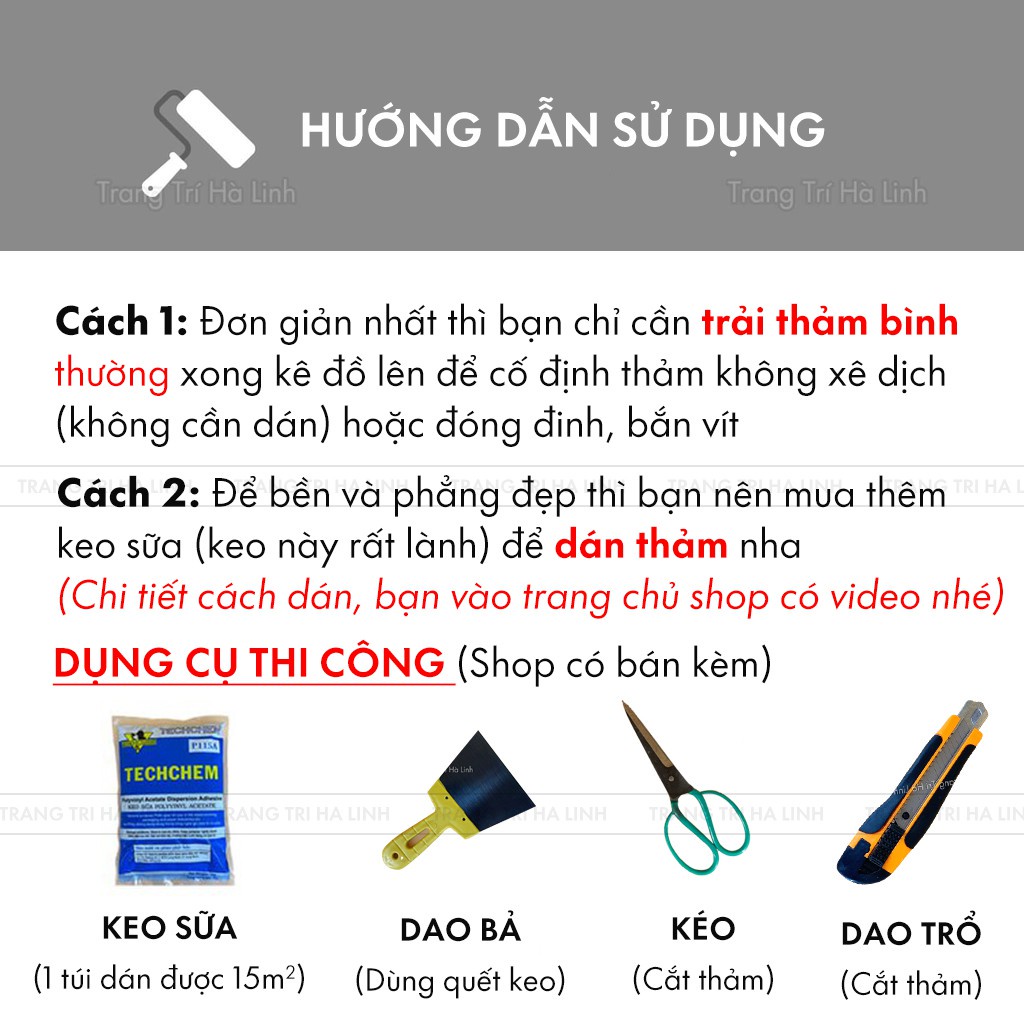 (Bạn truy cập vào shop trên điện thoại sẽ có video hướng dẫn thi công thảm nha)