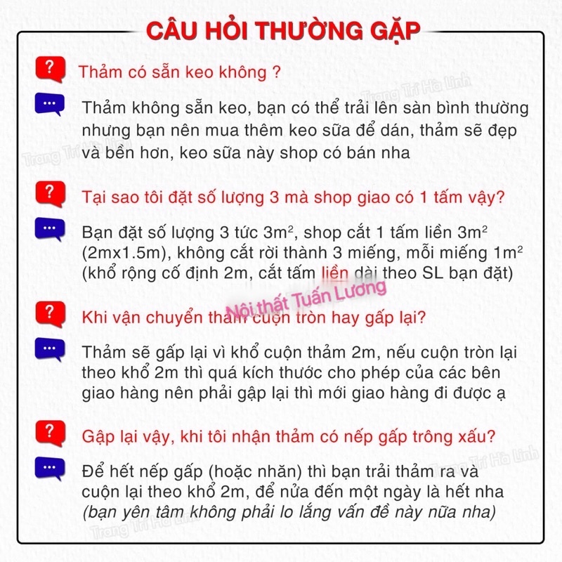 Lưu ý: Bạn nên mua dư ra khoảng 1-2 m2 trừ trường hợp không may bị thiếu trong khi thi công. Và khi khách mua dưới 10m2 shop sẽ bổ đôi thành rộng 1m để dễ vận chuyển