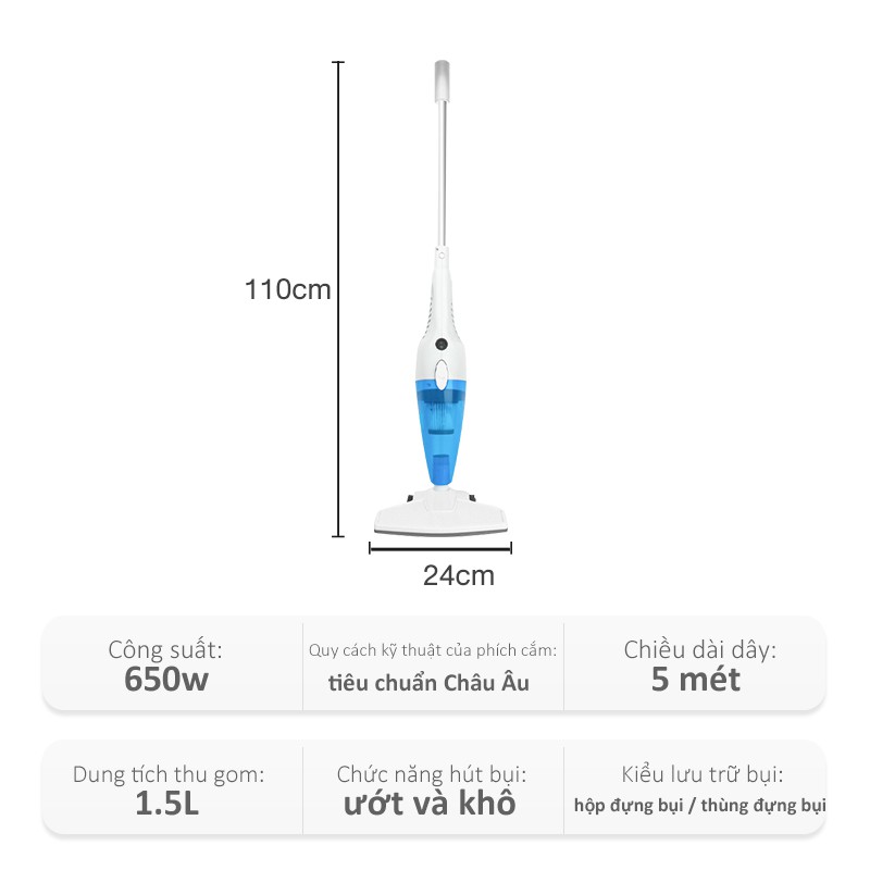 - Thùng chứa bụi dung tích lớn 1.5L, đổ bụi một nút.
