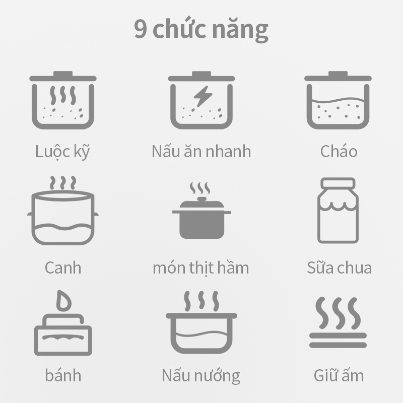 - 9 chức năng:Luộc kỹ/Nấu ăn nhanh/Cháo/Canh/món thịt hầm/Sữa chua/bánh/Nấu nướng/Giữ ấm.