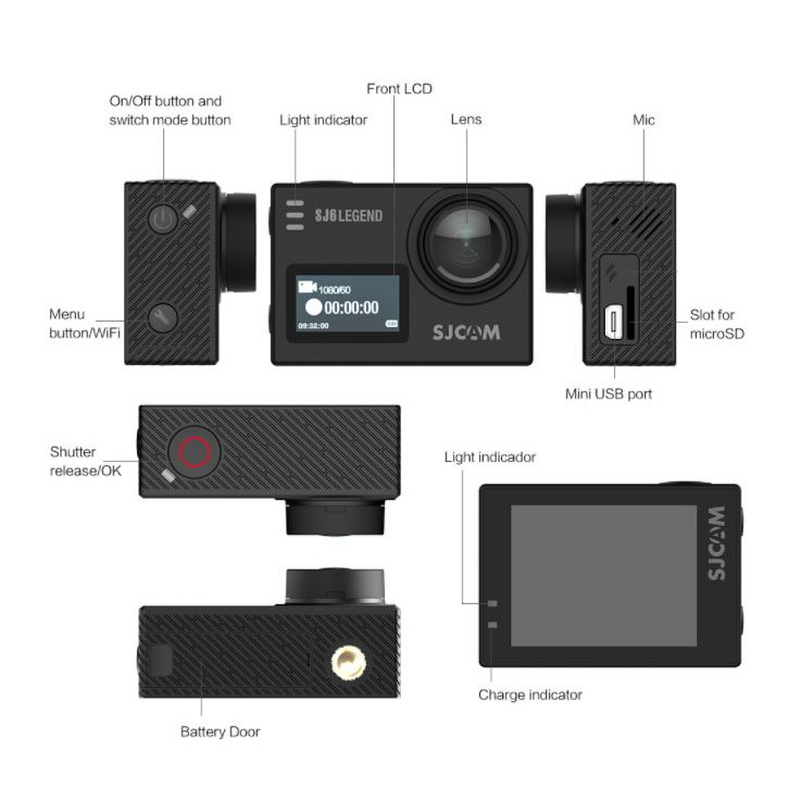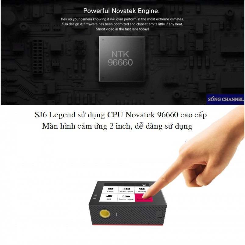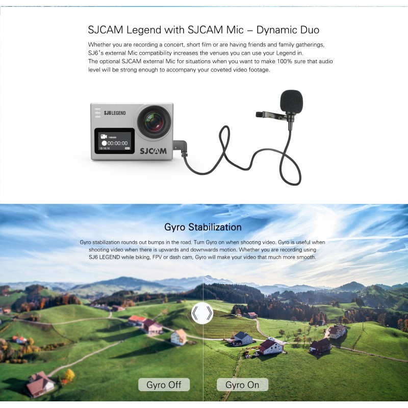 SJ Cam SJ6 Legend (Camera Cao Cấp Của SJ Cam)SJ6 Legend là một chiếc camera cao cấp của SJCam với khả năng quay 4K sắc nét, chân thực khi được trang bị Chip Novatek 96660 cao cấp, cảm biến Panasonic MN34120PA. Cùng với khả năng chống rung Gyro sẽ làm cho video của bạn trờ nên mượt mà hơn bao giờ hết. Ngoài ra, Sjcam SJ6 Legend còn có màn hình cảm ứng 2 inch, hỗ trợ lỗ cắm míc ngoài và có thể điều khiển bằng remote dời ( mua thêm).