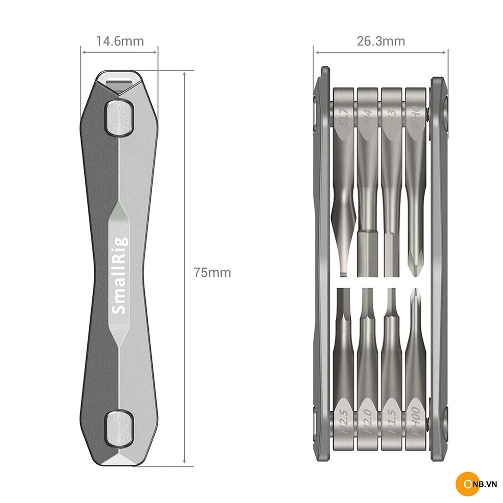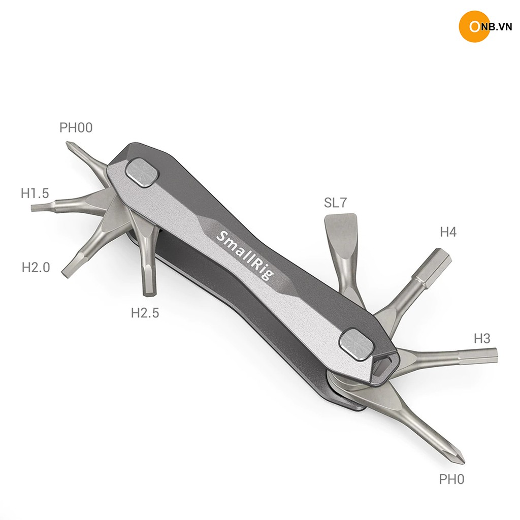 SmallRig Multi-Tool 2432 - Thanh Vặn Ốc Đa Năng Máy Ảnh và Gimbal. Thiết kế kim loại, đẹp, nhỏ gọn tiện dụng, bỏ túi dễ dàng, khi cần lấy ra ! Vặn được 8 loại đầu ốc khác nhau ! Trọng lượng chỉ 55 gram.- 7mm length flat head screwdriver H1.5, H2.0, H2.5, H3, H4 Allen wrenches, and two Phillips head screwdrivers PH0 and PH00