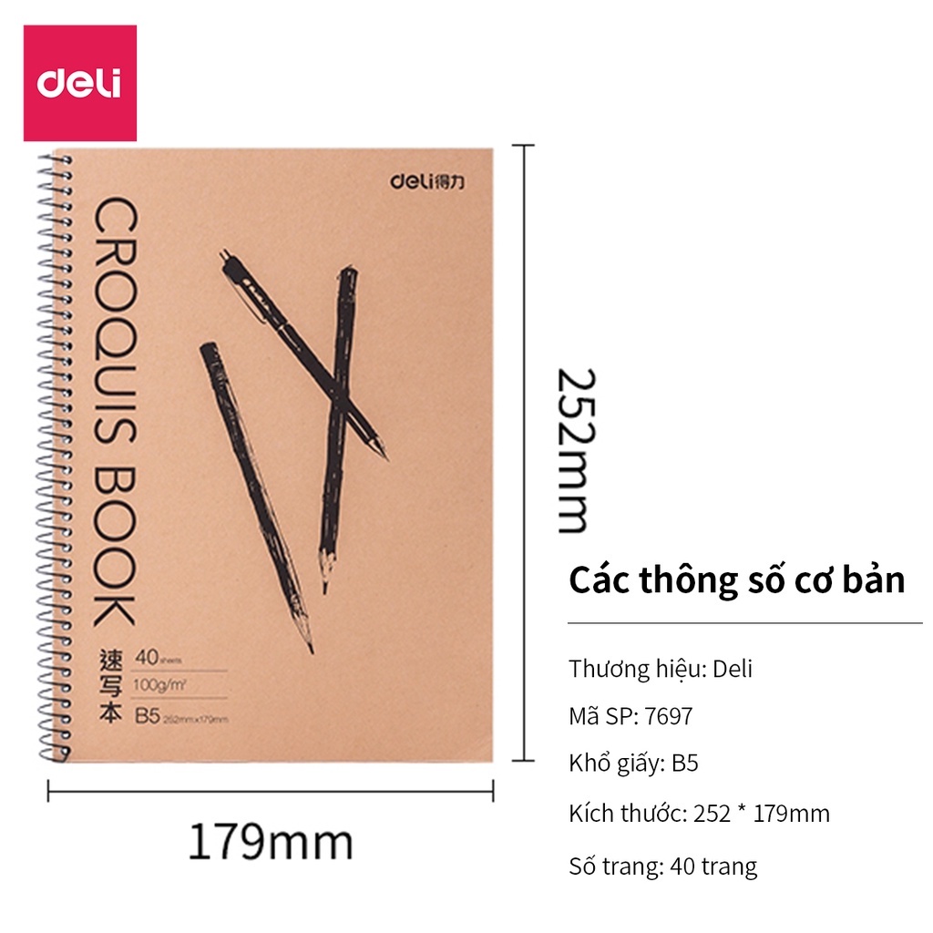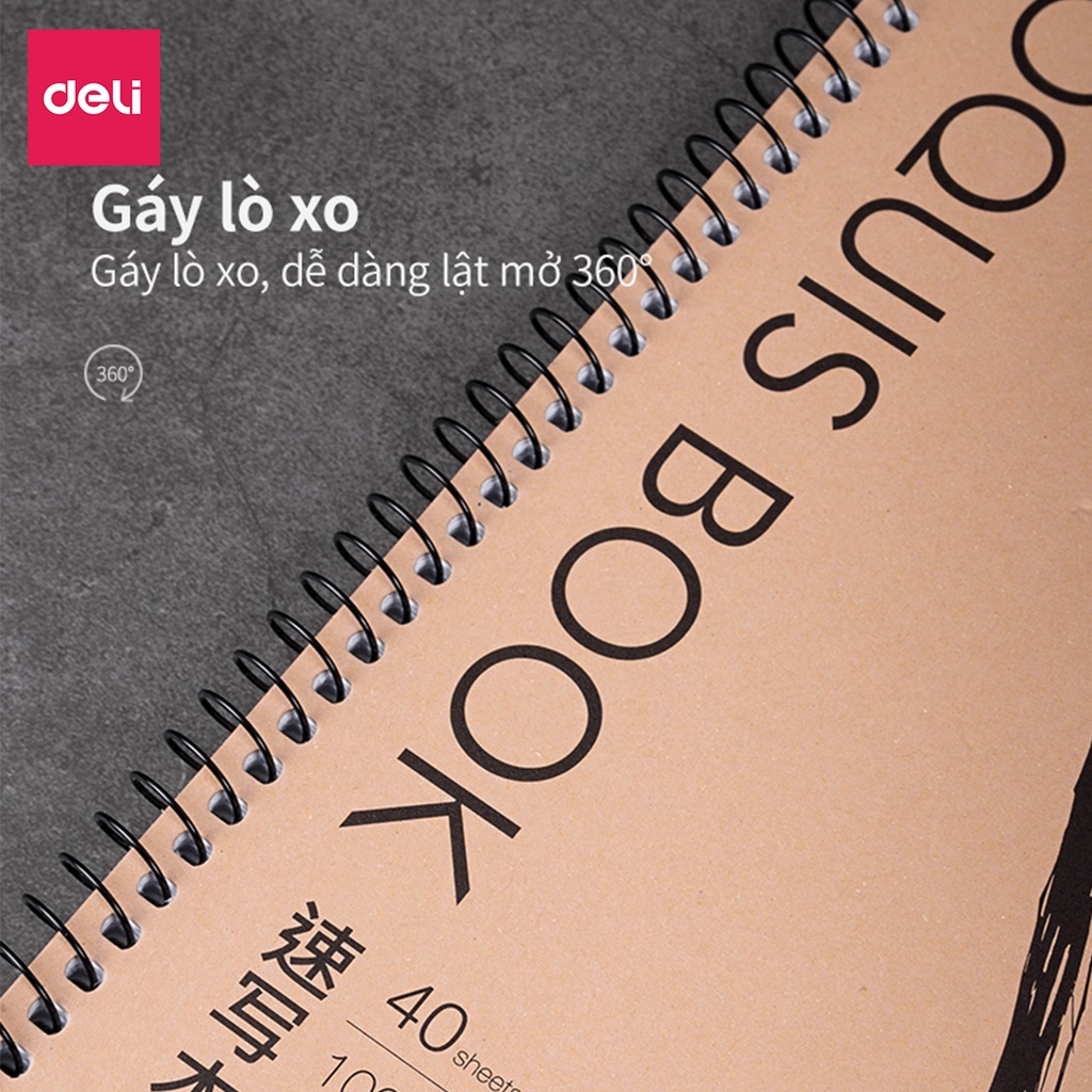 Sổ tay vẽ chì phác thảo sketchbook Deli 40 trang 100gsm khổ ngang A4/B5 gáy lò xo dùng cho mỹ thuật phác họa==========================================================================