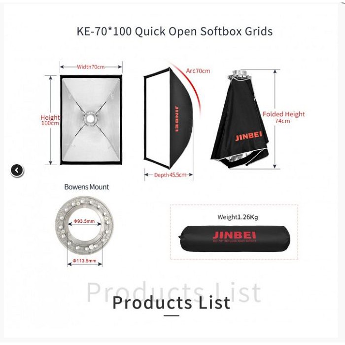 Sản phẩm bao gồm: 1 x Jinbei KE 60 x 90, 1 x bộ khuếch tán bên trong, 1 x bộ khuếch tán phía trước màu trắng, 1 x túi.