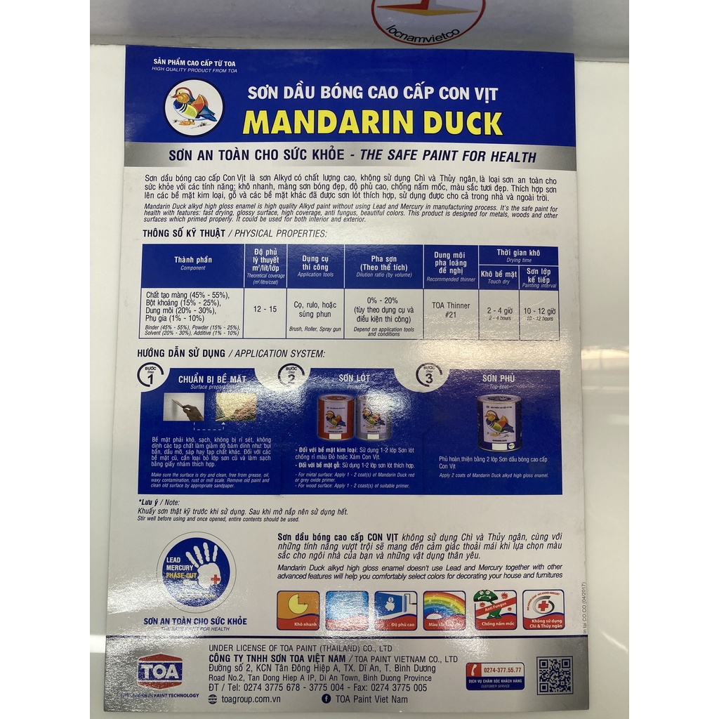 Sơn dầu con vịt Mandarin Duck Không sử dụng chì và thủy ngânThích hợp sơn lên các bề mặt kim loại, gỗ và các bề mặt khác đã được sơn lót thích hợp, sử dụng được cho cả trong nhà và ngoài trời