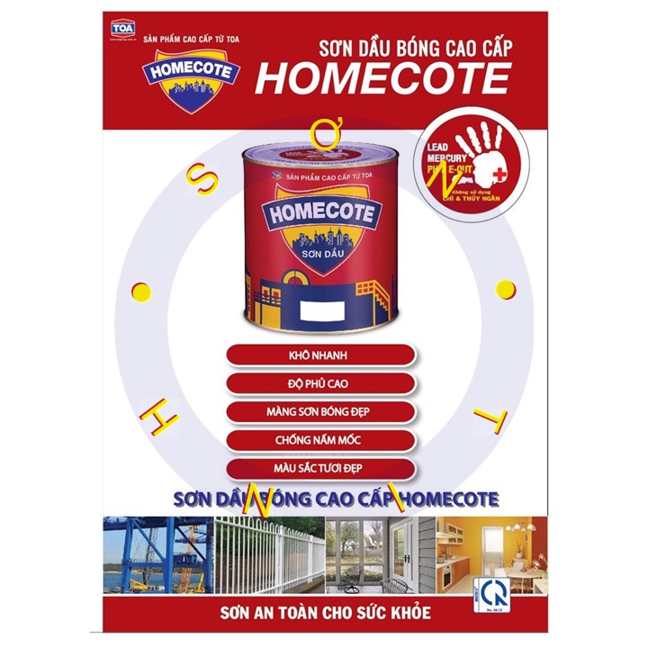 Sơn dầu bóng cao cấp Homecote là loại sơn Alkyd chất lượng cao, không sử dụng Chì & Thuỷ Ngân, là loại sơn an toàn cho sức khoẻ với các tính năng: Khô nhanh, màng sơn bóng đẹp, độ phủ cao, chống nấm mốc, màu sắc tươi đẹp.MỤC ĐÍCH SỬ DỤNG: